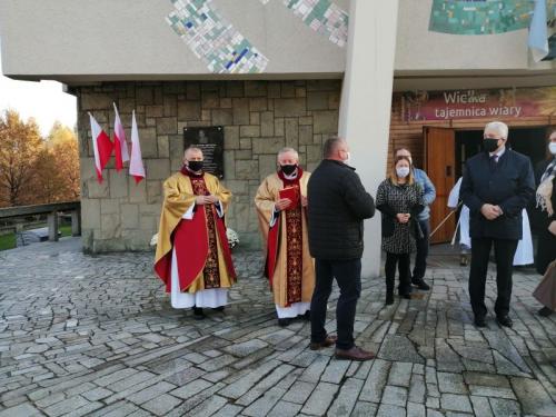 Po mszy wierni i przedstawiciele organizacji z naszej parafii szli w procesji na cmentarz pod pomnik poległych mieszkańców Pisarzowic podczas I i II wojny światowej. Tam odbywała się część uroczystości poświęcona żołnierzom i upamiętniająca odzyskanie przez Polskę Niepodległości w 1918 roku. Obostrzenia związane z pandemią i tutaj odbiły swoje piętno. Po mszy świętej ksiądz proboszcz z ks. Piotrem odmówili modlitwę za poległych żołnierzy. Zapalono znicze przed tablicą płk. Mariana Pilarskiego w obecności, burmistrza Wilamowic Mariana Treli, członków Rady Sołeckiej i wiernych. Następnie grupka osób udała się na cmentarz pod pomnik poległych mieszkańców Pisarzowic na różnych frontach obu wojen światowych.