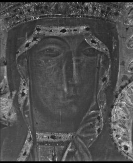 Od lewej: Fot. 1. Obraz Matki Boskiej Częstochowskiej z Hecznarowic po wyjęciu z nastawy ołtarzowej, Fot. 2. Badanie rentgenowskie obrazu z widocznymi przemalowaniami twarzy Maryi