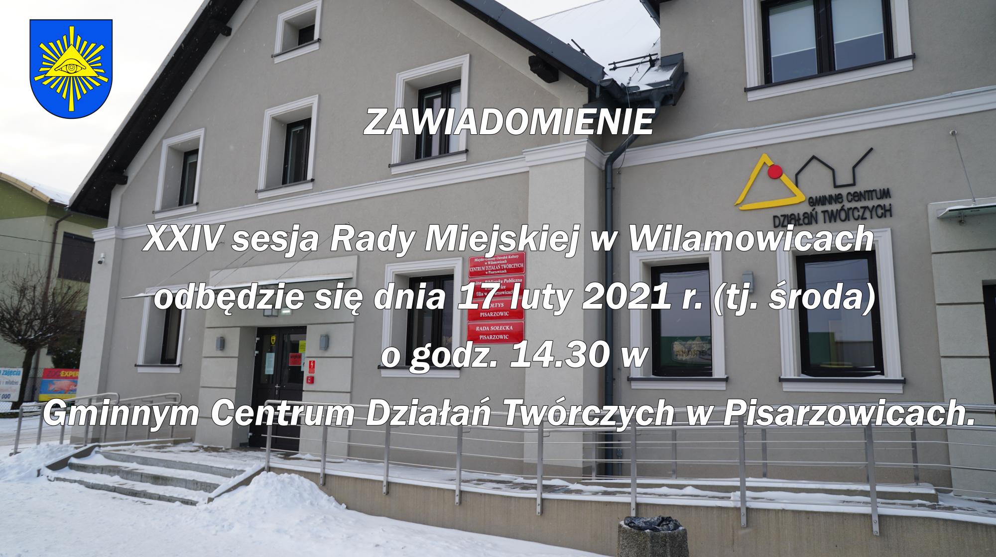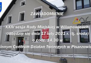 XXIX sesja Rady Miejskiej w Wilamowicach odbędzie się dnia 17 lutego 2021 r. (tj. środa) o godz. 14.30 w Gminnym Centrum Działań Twórczych w Pisarzowicach (43-332 Pisarzowice ul. Św. Floriana 26).