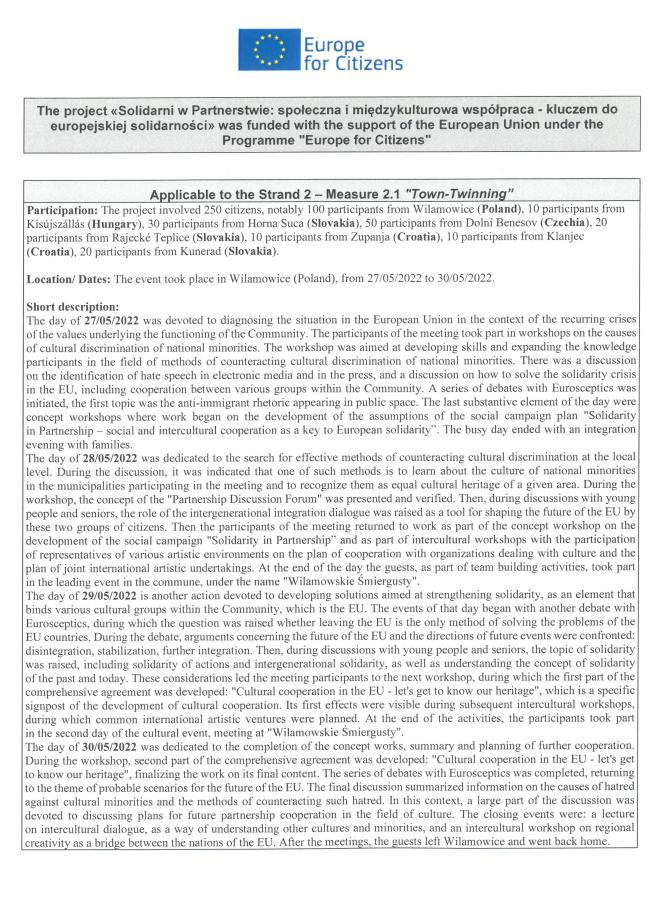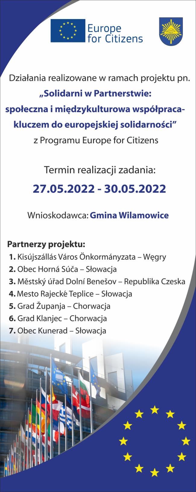 Wszystkie zadania projektowe odbyły się w Wilamowicach w dniach 27-30 maja 2022 r. i skupiły 250 obywateli miast partnerskich z Kisújszállás (Węgry), Hornej Súčy, Kuneradu i Rajeckich Teplic (Słowacja), Dolníego Benesova (Czechy), Klanjca i Županji (Chorwacja) oraz Wilamowic. Podczas czterech dni spotkań uczestnicy projektu wzięli udział w warsztatach, dyskusjach i wykładach poświęconych współpracy międzynarodowej opartej na zasadzie solidarności, łączącej wszystkie kraje Unii Europejskiej. Projekt promował postawy solidarności oraz poszanowania praw człowieka zwłaszcza wobec uchodźców poszukujących ochrony w Polsce, poprzez kształtowanie pozytywnego wizerunku innych kultur oraz wspieranie dialogu i spotkań międzykulturowych z ludźmi z różnych środowisk i kultur. Podczas działań projektu omawiano pozytywne wartości jakie niesie obecność w UE i co dzięki niej osiągnęliśmy. Podkreślaliśmy w szczególności olbrzymi postęp cywilizacyjny, który udało się dzięki UE osiągnąć w różnych aspektach życia społecznego i kulturalnego. Dzięki działaniom projektowym pokazaliśmy, że poprzez współpracę i wytrwałe konsultacje można osiągnąć porozumienie w każdej kwestii. W projekcie zwracaliśmy uwagę na potrzebę solidarnego działania w każdej ważnej sprawie dotyczącej narodów UE, co było jednym z elementów kampanii społecznej „Solidarni w Partnerstwie - społeczna i międzykulturowa współpraca kluczem do europejskiej solidarności”. Poprzez debaty i dyskusje staraliśmy się na własnych przykładach i doświadczeniach, przekazać większą wiedzę o osiągnięciach UE.